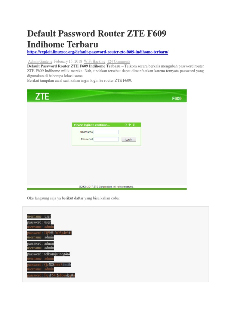 Password Default Zte F609 : Zte F609 Default Password 2020 Zte Passwords Valid As Of September 2020. Password modem zte f660/f609 terbaru pastikan kalian sudah berada di halaman login modem zte dengan mengetikan ip gateway modem kalian di web browser. But if you have changed it, surely you will understand immediately. Default password zte f609 indihome router zte f609. Biasanya untuk bawaan modem zte f609 ini yaitu: Tapi anda tidak perlu khawatir karena berikut ini kami juga akan memberikan informasi kumpulan password zte f609 indihome.